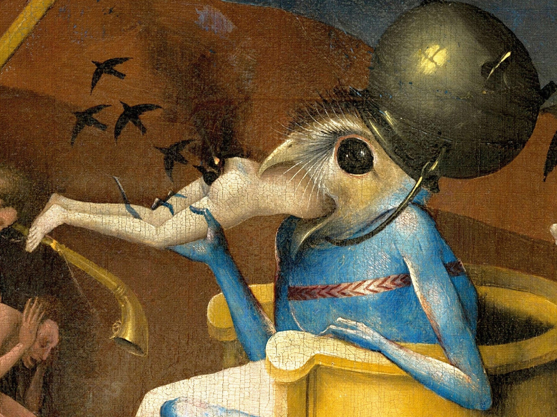 La rappresentazione dell'inferno è sempre stata un banco di prova per scatenare le fantasie più perverse degli artisti. Ma li batte tutti Jeronymus Bosch, che nell'anta dell'Inferno del trittico del Giardino delle Delizie, dipinto dal 1480 al 1490, ne ha inventate di tutti i colori, anticipando di oltre tre secoli le più spericolate fantasie dei surrealisti. Qui un particolare con un demone in trono con testa di uccello e pentola come elmo che divora un dannato dal cui sedere escono una fumata nera e uno stormo di corvi.