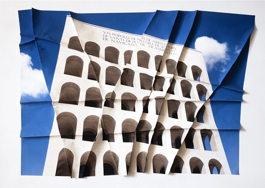 Carla Cacianti, artista e graphic designer che è stata mia collega allo IED, con Eur 42/24 nel 2024 ha fatto una ricerca in cui una normale ripresa fotografica si fa oggetto artistico tridimensionale proprio grazie alla frammentazione e ricomposizione su piani diversi.