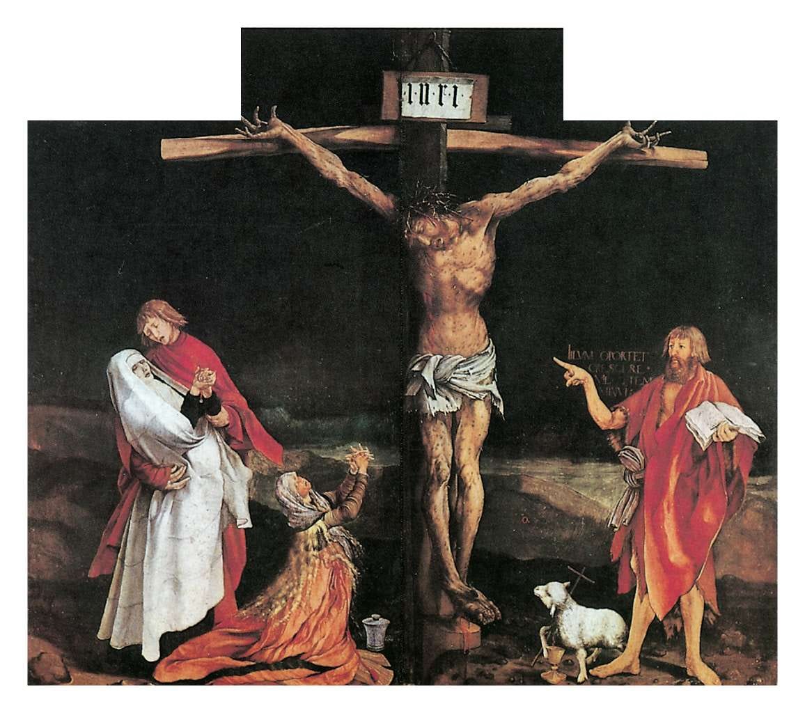 La passione di Cristo ha spesso stimolato la fantasia degli artisti per rappresentare il dolore. Uno dei più espressivi è senza dubbio Matthias Grünewald che, nella tavola centrale del Polittico di Isenheim (1512-1516) rappresenta un Cristo con tutti i segni delle percosse, delle torture, delle numerose ferite inflittegli durante la Passione. Il corpo è pesante, il volto affranto, le mani innaturalmente aperte nello spasimo finale. E' solo un pover'uomo, in cui si è spenta ogni luce divina ed è rimasta solo la sofferta umanità.