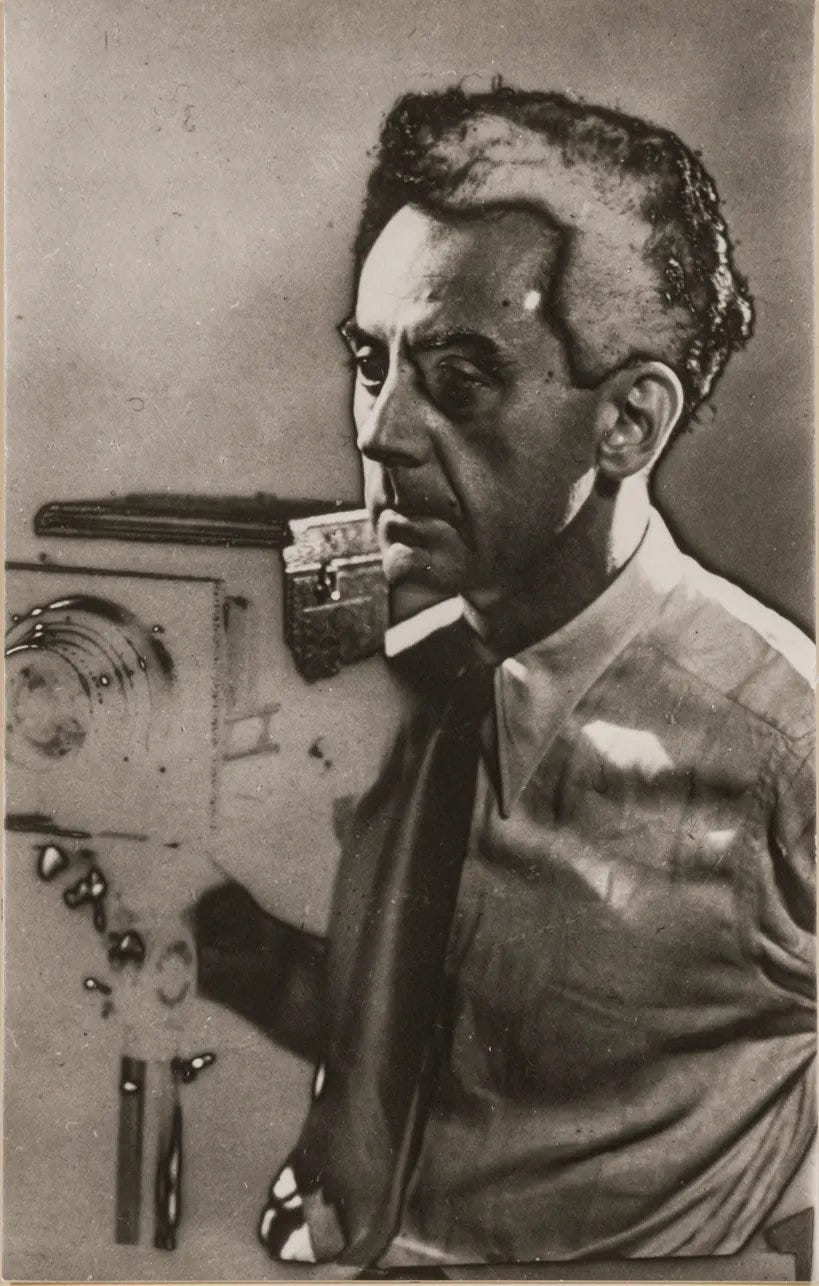 Man Ray sfrutta un incidente per inventare l'effetto fotografico di solarizzazione, in cui una forte sovraesposizione produce un rovesciamento della curva di annerimento dei sali d'argento. Gli era successo che durante lo sviluppo in camera oscura si era improvvisamente accesa una luce. Invece di buttare le foto rovinate, egli le osservò e ne fece una delle sue tecniche, ben visibile in questo suo autoritratto del 1934.