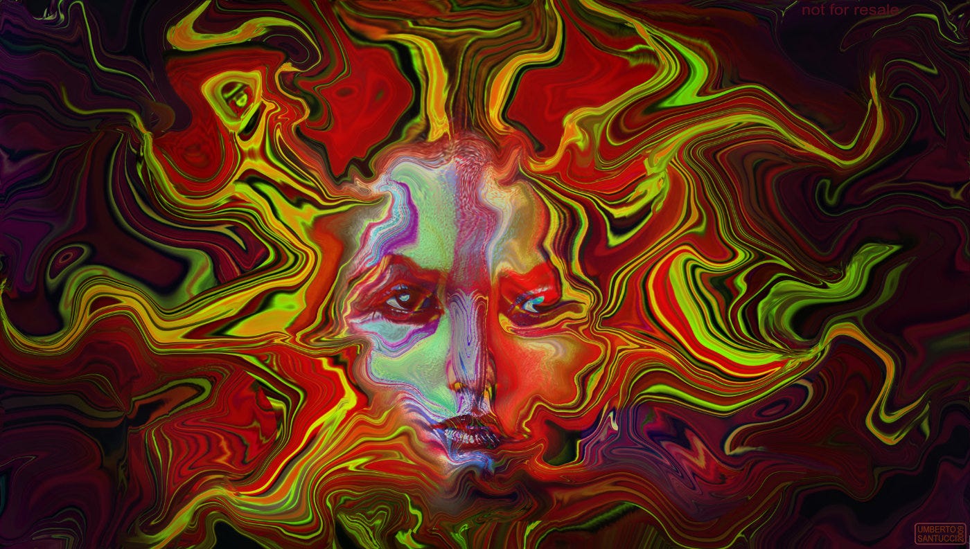 I programmi informatici di elaborazione di immagini di cui disponiamo ci mettono a disposizione una grande quantità di effetti con cui possiamo deformare le immagini. Io ho usato la fluidificazione, un algoritmo che distorce le forme incurvandole, per questo mio Specchio di Medusa, un'opera digitale del 2009 in cui le forme incurvate dalla fluidificazione alludono alla chioma di serpenti della creatura mitica che appare nello specchio di Perseo per autopietrificarsi. Altri miei lavori digitali con l’effetto di fluidificazione si trovano in questa pagina del sito che presenta la mia attività artistica.