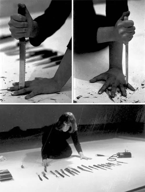 Dalla disarticolazione del soggetto si passa alla ferita inferta alla tela, come abbiamo visto con Lucio Fontana, e poi alla ferita che lo stesso artista procura a se stesso nella sua ardita performance, come è il caso di questo Rhythm 10 di Marina Abramovich, una performance del 1973 in cui l'artista esegue in pubblico il gioco russo di colpire col coltello gli spazi fra le dita aperte della mano, e quando si ferisce cambia coltello e ricomincia da capo. Nella performance l'artista usa venti coltelli.
