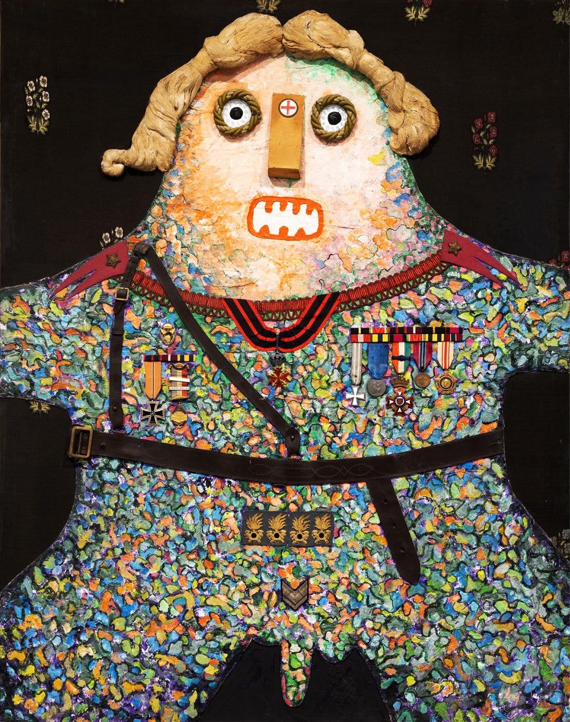 Enrico Baj ha realizzato serie di quadri polimaterici rappresentanti grotteschi generali come questo del 1973, con gli occhi sbarrati e la bocca aperta nel comando o nella paura di una bomba, le decorazioni improbabili, la divisa che diventa una seconda pelle e il piccolo membro pendulo, ad esprimere la ripugnanza dell'artista di fronte ai burocrati della guerra.