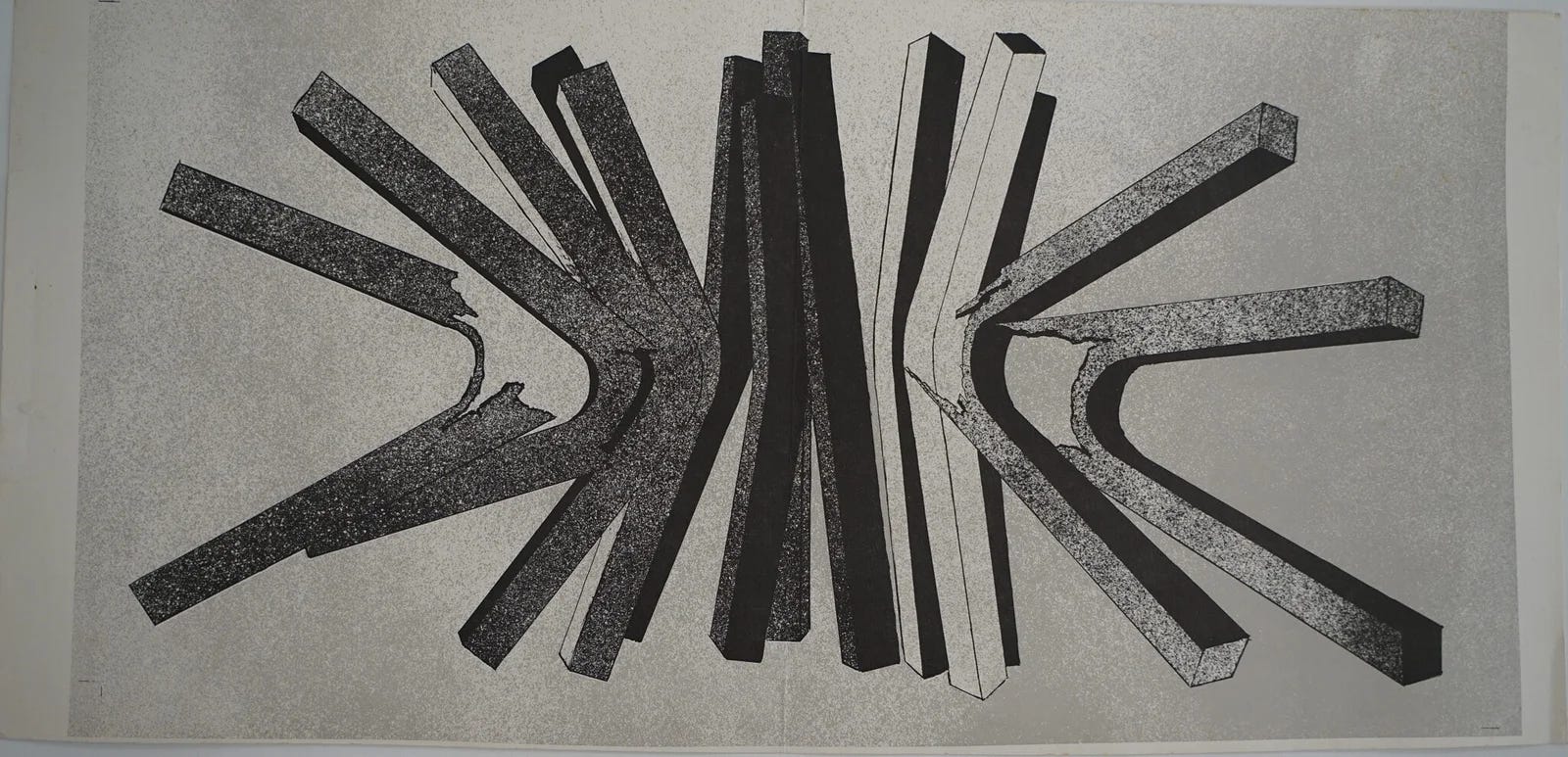 In modo molto meno cruento Rosanna Lancia, un'artista che viveva e lavorava a Roma nell'appartamento sopra a quello in cui abitavo io, negli anni '70 ha a lungo studiato i punti di rottura, facendone i soggetti stessi di suoi disegni, quadri e sculture, come in questo disegno del 1977 intitolato Progressione orizzontale. L’artista osservava le forme delle tensioni e delle fratture di barre di legno, ferro, plastica, come momenti drammatici cruciali ispirati alla teoria delle catastrofi di René Thom.