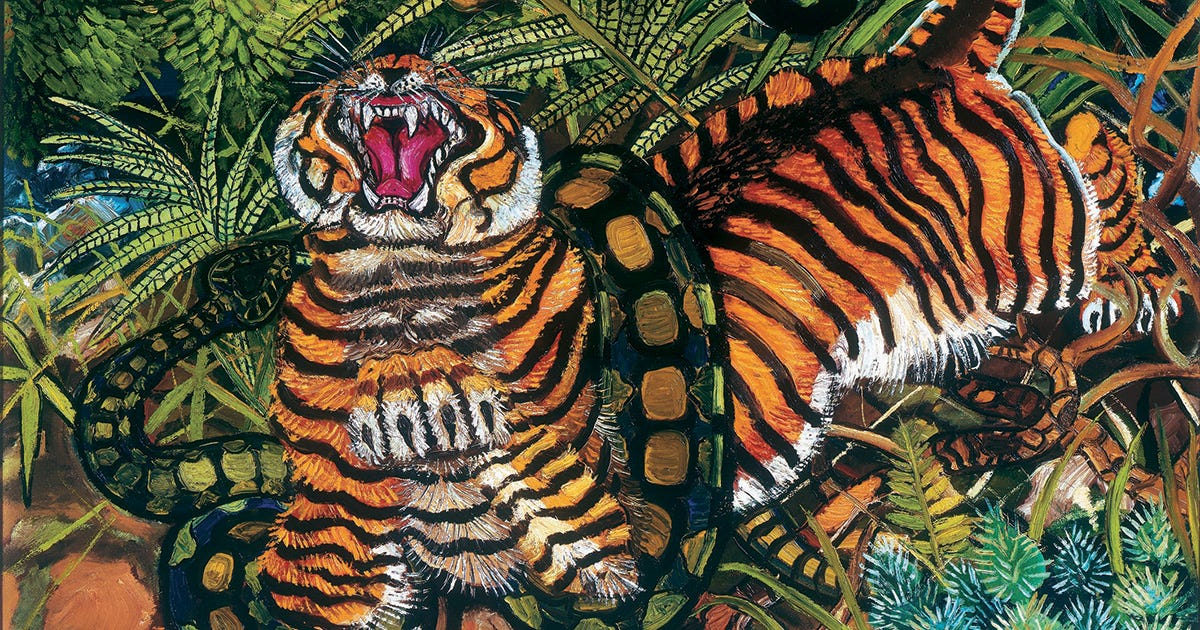 Antonio Ligabue visualizza la violenza della natura con la tigre in lotta con un grande serpente che la sta avvolgendo nelle sue spire. Le pennellate sono grandi e robuste, i colori sono vivaci ed esaltati dalle pennellate nere che disegnano le striature della tigre, le macchie del serpente e le diverse strutture della vegetazione in cui i sue lottatori sono immersi. La deformazione espressiva è evidente nella testa della tigre, con la bocca esageratamente grande come a voler visualizzare il ruggito della belva.