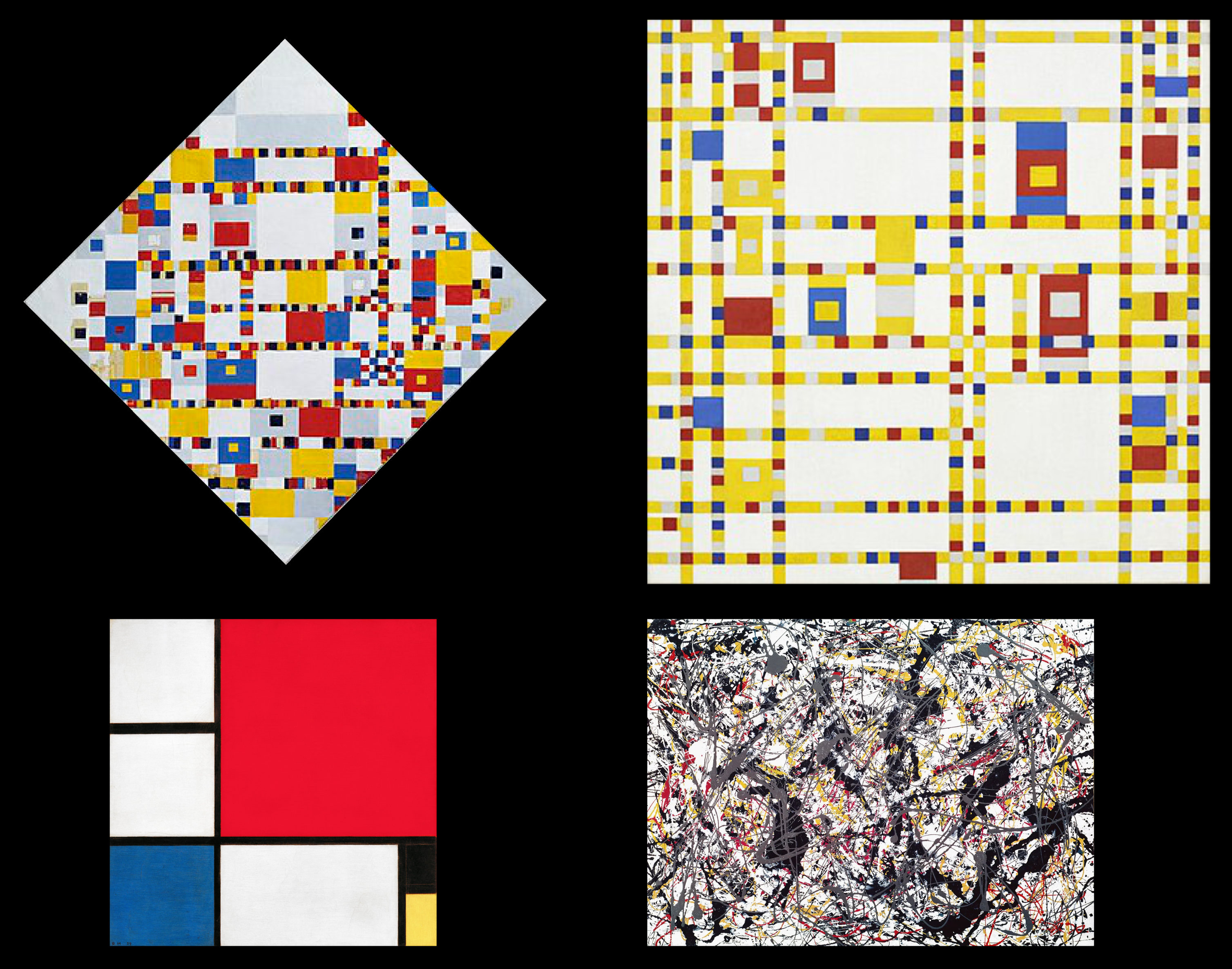 Una via di mezzo la vediamo nei Victory e Broadway Boogie Woogie del 1944 di Piet Mondrian (le due immagini in alto), che con essi vuole esprimere il massimo della trasgressione, della vivacità e dell'improvvisazione, in omaggio ai ritmi indiavolati della danza afroamericana. Se li confrontiamo con Tinguely o con Pollock (in basso a destra), ci sembrano ordinatissimi, se invece li confrontiamo con le altre opere di Mondrian (in basso a sinistra) o con Malevich, diventano alquanto sbarazzini e ci mostrano come ordine e disordine siano concetti relativi.