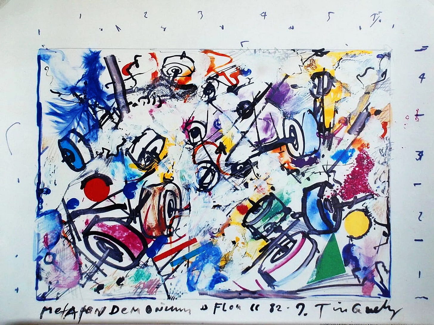 All'estremo opposto troviamo questo Pandemonium, un poster di Jean Tinguely del 1982, dove la disposizione degli elementi compositivi è caotica e risponde alla regola di evitare qualsiasi regola o regolarità, il tutto accentuato da un grafismo molto rapido e gestuale. In tutte le sue opere Tinguely evita qualsiasi "buona" struttura compositiva, ottenendo una nuova coerenza stilistica che rigorosamente evita qualsiasi tipo di ordine.