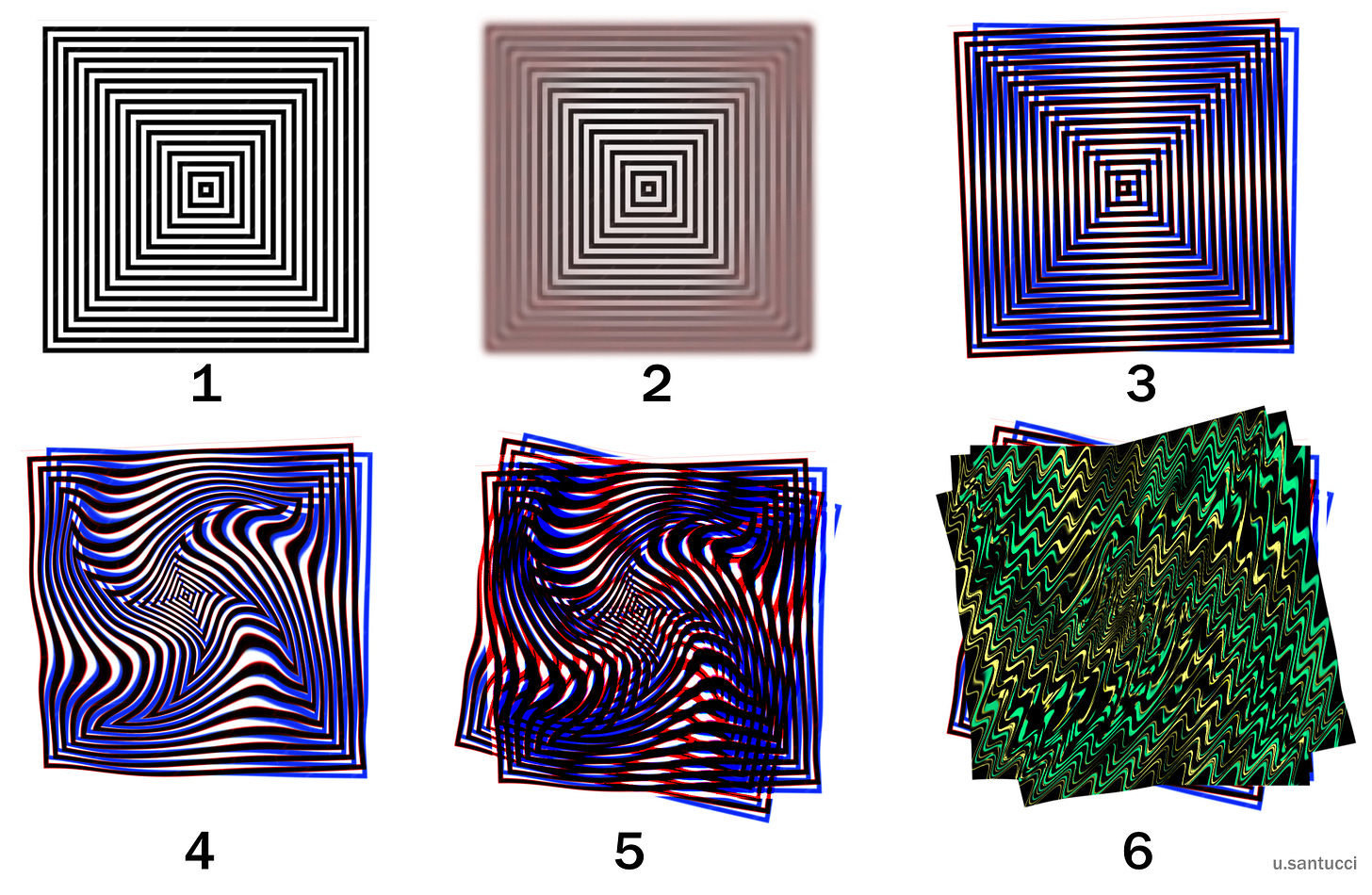 I programmi grafici per computer hanno funzioni con cui si possono "disturbare" le funzioni normali per ottenere effetti visivi più o meno interessanti. Io propongo a scopo dimostrativo una elaborazione molto semplice di una grafica op altrettanto semplice, consistente in quadrati bianchi e neri concentrici e riducentisi secondo una scala regolare, come si vede nella fig. 1. Nella fig. 2 ho applicato il disturbo più elementare, la sfocatura gaussiana. a cui ho aggiunto una leggera colorazione rossa. Nella fig. 3 ho sovrapposto un duplicato con una leggera rotazione, in modo da generare interferenza fra linee e colori (una delle griglie l'ho colorata in blu). Nella fig. 4 ho sottoposto la figura precedente ad un effetto di fluidificazione che incurva le linee. Nella fig. 5 ho fatto qualcosa di simile alla fig. 3, sovrapposizione, rotazione e effetto colore. Nella fig. 6 ho introdotto un effetto di ondulazione e un ulteriore colore. Come si vede i successivi disturbi producono immagini del tutto diverse da quella di partenza.