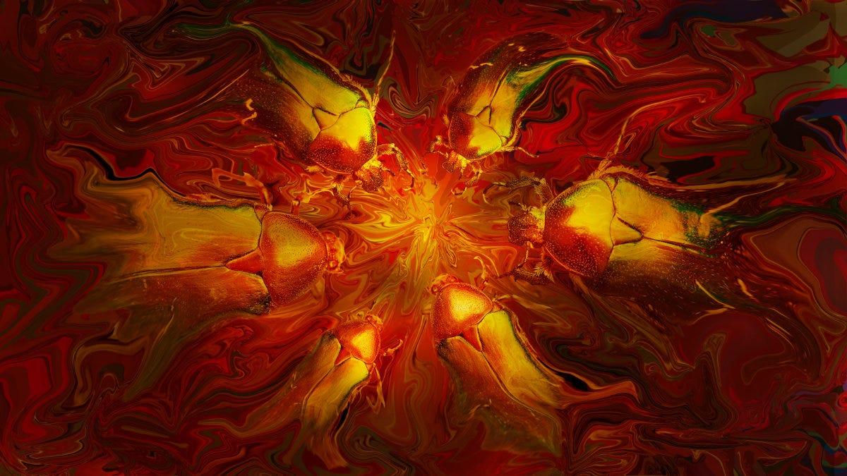 Tornando alla glitch art e alla deformazione espressiva, ecco una mia composizione bitmap dedicata agli scarabei dorati, gli insetti magici venerati fin dall'antico Egitto, che con la fluidificazione delle forme ho fatto liquefare nei colori del fondo, creando una sorta di osmosi dinamica tra figure e fondo.