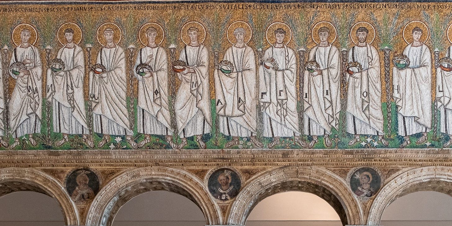 Nel mosaico bizantino di Sant'Apollinare Nuovo di Ravenna (VI sec.) la fila di vescovi è assai regolare. I personaggi hanno la stessa postura, gli stessi panneggi, le stesse aureole a rappresentare l'uniformità della loro funzione sacerdotale, ma presentano piccole variazioni che hanno lo scopo di identificarli insieme con le scritte in alto, con i volti e le capigliature tutti diversi. Nell'insieme la composizione ha lo stesso ordine aulico e ieratico di una processione solenne.